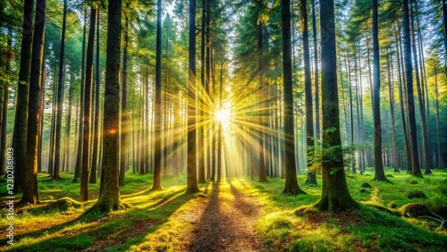 © Danicha, Obraz premium Majestic Bosque: Sunlight Dappled Trees & Copy Space for Text