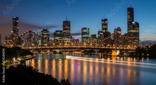 © zui, Naklejka premium Majestic brisbane skyline at twilight, story bridge illuminated over tranquil river reflections
