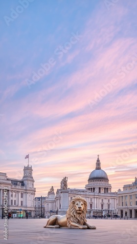 © pvl0707, Obraz premium Majestic bronze lion resting at dusk in front of the grand gallery in Trafalgar Square, London, showcasing vibrant skies