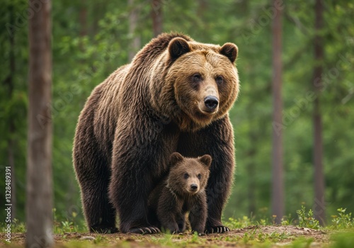 Fototapeta premium Majestic brown bear and cub standing in lush forest wilderness