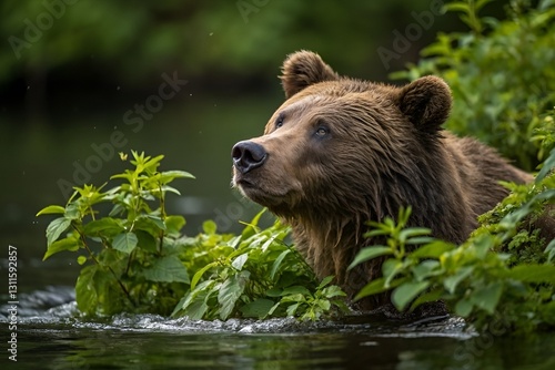 © PAPPUS_STORE, Obraz premium Majestic Brown Bear Emerging from Water in Lush Green Wilderness