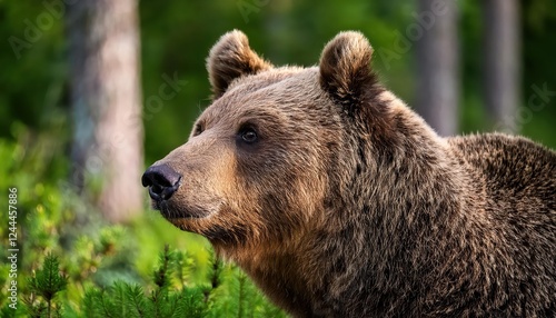 © netsay, Obraz premium Majestic Brown Bear in Summer Forest Intimate Side Portrait with Verdant Background, Capturing the Power and Grace of Natures Apex Predator.