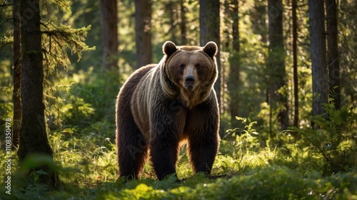 © Thanapol, Fototapeta premium Majestic brown bear walking through a sunlit forest during a tranquil afternoon