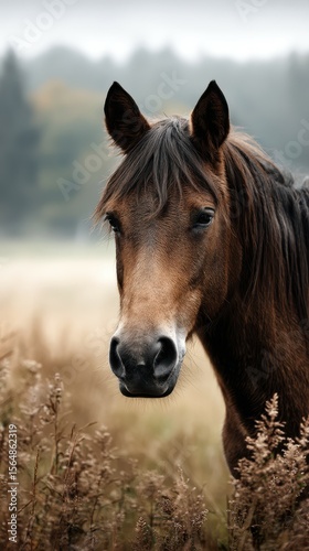 Naklejka premium Majestic brown horse gazing serenely in a misty field during early morning hours