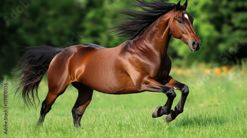 © zacty6, Obraz premium Majestic Brown Horse Gracefully Galloping Through Lush Green Meadow Surrounded by Vibrant Flora Under Bright Blue Sky in Beautiful Natural Landscape