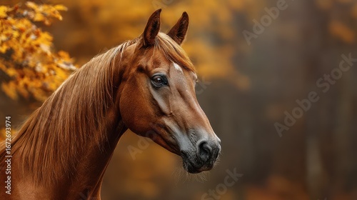 Fototapeta premium Majestic brown horse standing amidst golden autumn foliage in a serene forest...