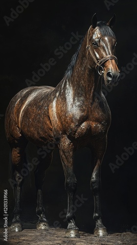 Fototapeta premium Majestic brown horse standing elegantly in dramatic lighting in an artistic...