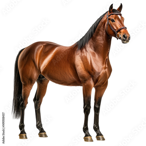 © Pricha.RT, Obraz premium Majestic brown horse standing proud in an elegant pose highlighting its strong physique and shiny coat against a white background perfect for equine photography