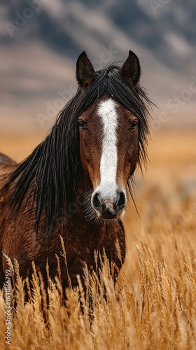 © Michael, Obraz premium Majestic brown horse stands in golden grass under a clear sky at sunset in a serene landscape