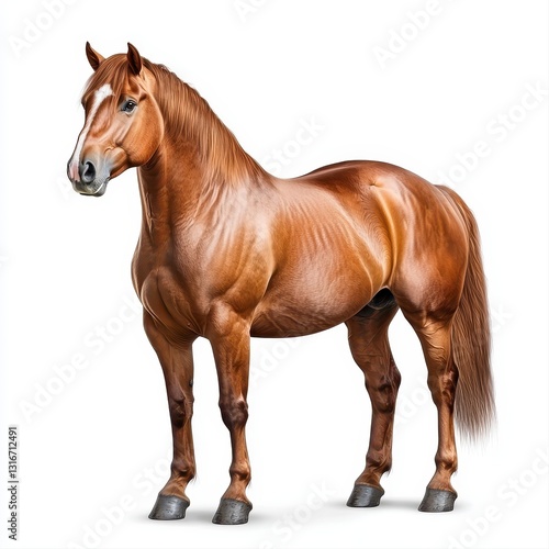 © Suppattra, Obraz premium Majestic brown horse with muscles rippling beneath sunlight in a serene pastoral setting capturing grace and strength