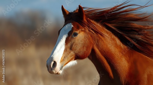 Fototapeta premium Majestic brown horse with white blaze marking on face and flowing mane...