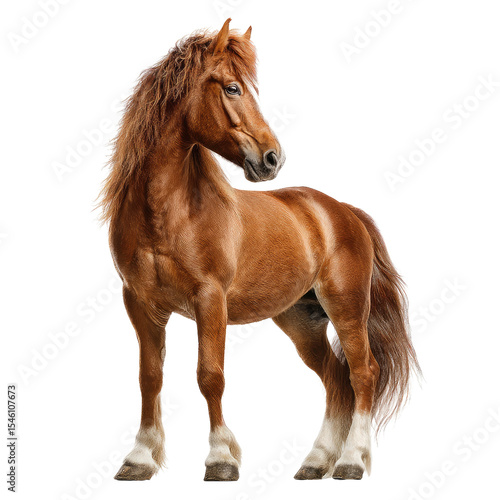 © arthit, Naklejka premium Majestic Brown Pony Standing Gracefully Against White Background with Flowing Mane and Alert Expression