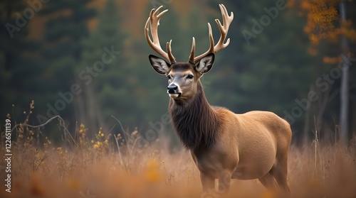 Naklejka premium Majestic Bull Elk in Autumn Meadow Stunning Wildlife Photography Breathtaking Nature Image Fall Colors Wild Animal Portrait