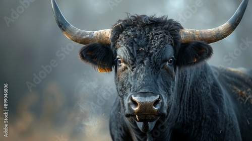 Naklejka premium Majestic bull is staring intensely with large horns, showcasing its power and...