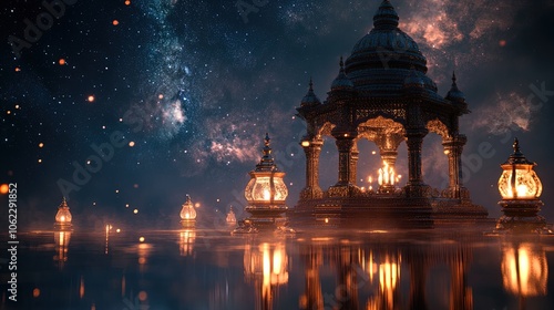 Fototapeta premium Majestic Candlelit Shrine with Traditional Motifs and Floating Lamps: Perfect Poster for Serene Home Decor or Yoga Studio Ambiance Under a Starry Celestial Sky