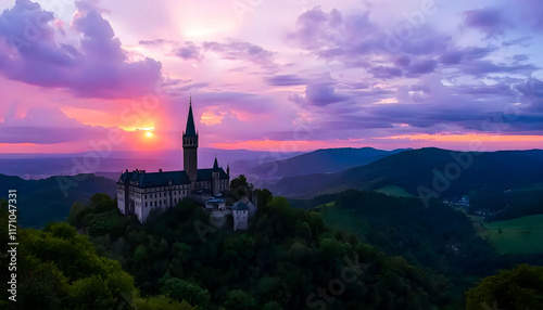 Fototapeta premium Majestic Castle at Sunset, Embracing a Dreamy Landscape