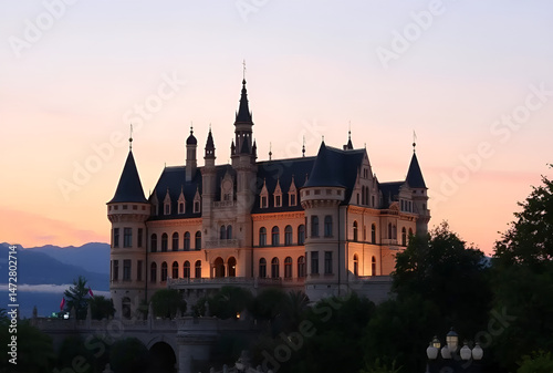 © Chikky, Fototapeta premium Majestic Castle at Sunset, Generative AI