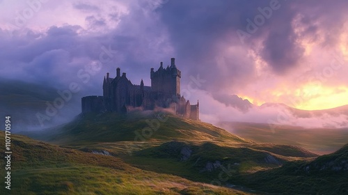 © suryono, Obraz premium Majestic castle on a hill at sunset, shrouded in mist and dramatic clouds.