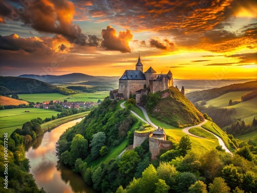 © Four888, Fototapeta premium Majestic Castle Overlooking Breathtaking Landscape at Dusk for Stunning Photography