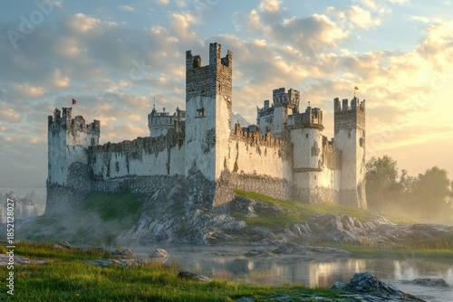 © YouraPechkin, Fototapeta premium Majestic castle standing on rocky terrain under dramatic sky at sunrise near water