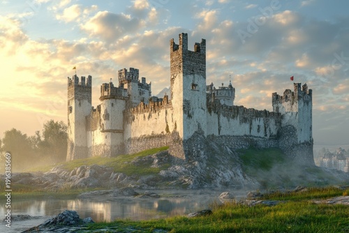 © YouraPechkin, Fototapeta premium Majestic castle standing on rocky terrain under dramatic sky at sunrise near water