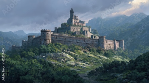 © Kitta Studio, Fototapeta premium Majestic Castle Surrounded by Fortified Stone Walls in Nature