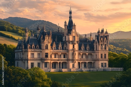 © Bos Amico, Naklejka premium Majestic castle with ornate facade and soaring spires nestled amidst scenic rolling hills bathed in the warm glow of a sunset evoking a sense of timeless elegance and grandeur