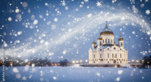 © MST, Obraz premium Majestic Cathedral Illuminated by Snowy Enchantment Under a Starry Sky