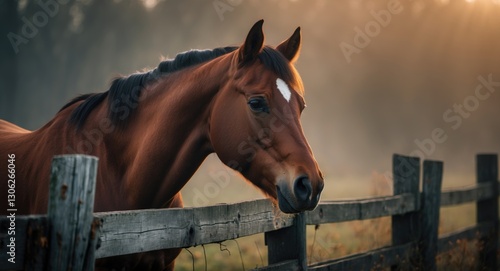© ArtificialHorizons, Fototapeta premium Majestic chestnut horse by a wooden barrier