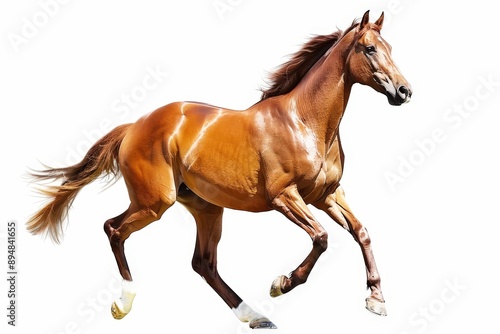 © Worrapol, Obraz premium Majestic Chestnut Horse Galloping: A powerful and graceful chestnut horse with a flowing mane and tail is captured mid-gallop, showcasing its athleticism and elegance against a white background. The h