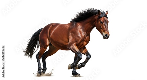 Fototapeta premium Majestic chestnut horse gallops powerfully, mane flowing, isolated on white background