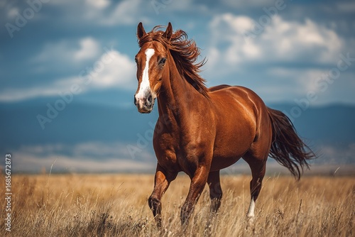 Fototapeta premium Majestic chestnut horse trots gracefully across a golden field under a blue...