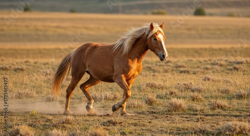 © Karam, Fototapeta premium Majestic chestnut horse with flowing mane gallops powerfully through sun-drenched golden prairie kicking up dust in a breathtaking display of freedom and wild spirit.