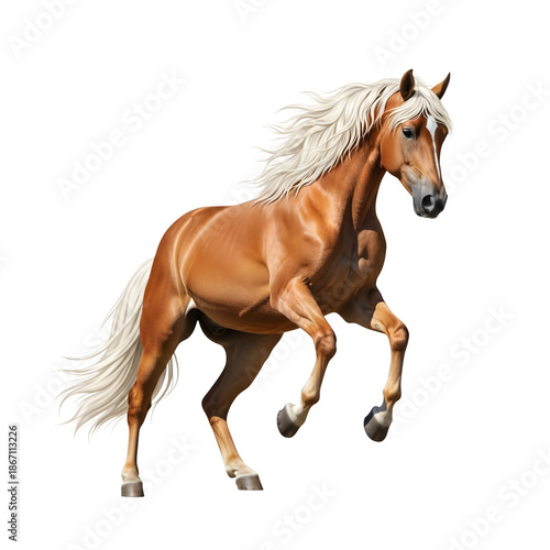 © SAFDAR, Obraz premium Majestic Chestnut Horse with White Mane and Tail Galloping Isolated on White Background