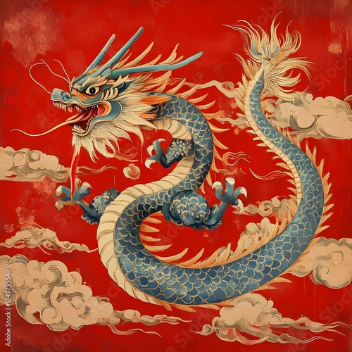 © Harry, Obraz premium Majestic Chinese Dragon Illustration for Cultural Celebrations, Wall Art, and Festive Designs. A vibrant illustration of a traditional Chinese dragon coiled amidst swirling clouds against a striking r