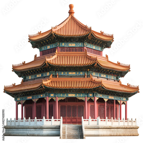 Naklejka premium Majestic Chinese Pagoda Ancient Architecture Three Tiered Roof Red Pillars