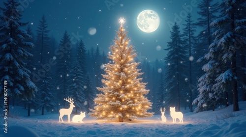 Fototapeta premium Majestic Christmas Tree in a Moonlit Snow-Covered Forest Clearing