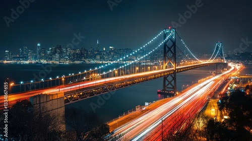 © Adiba sakila atmarin, Naklejka premium Majestic city bridge illuminated at night with blurred traffic lights streaks