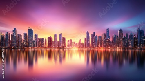Fototapeta premium Majestic city skyline at sunset, with buildings illuminated against a vibrant sky, reflecting on a calm river below