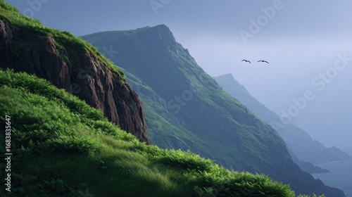 © Andrei, Naklejka premium Majestic cliffs rise above serene waters, enveloped in soft mist