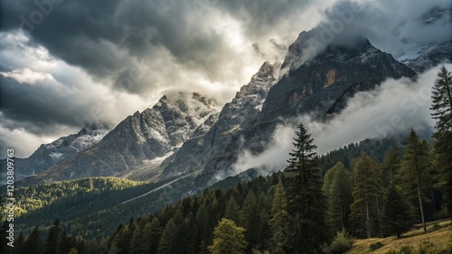 © Danicha, Fototapeta premium Majestic Cloud-Shrouded Mountain Range: Dramatic Landscape Photography