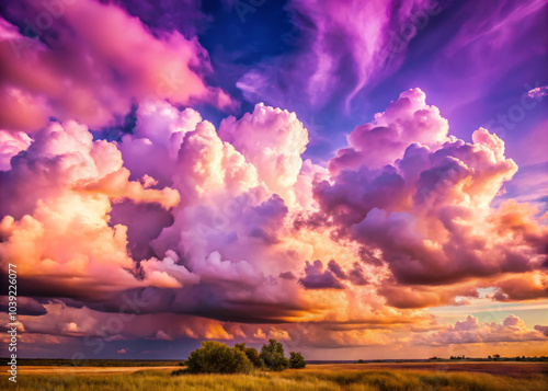 © Arethaawykoff, Obraz premium Majestic clouds fill sky with vibrant hues of purple and pink, creating stunning sunset backdrop. scene evokes sense of wonder and tranquility in natures beauty