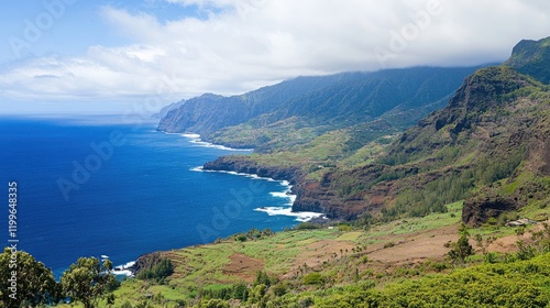 © Berkah1789, Obraz premium Majestic Coastal Mountains Ocean View Green Terraces