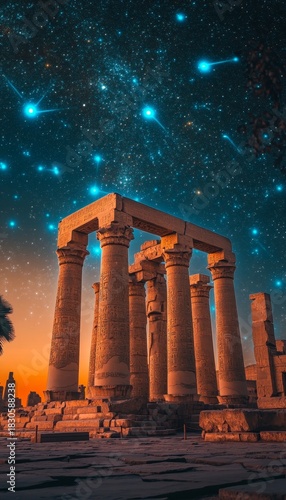 © Ilja, Fototapeta premium Majestic Columns Rise Under a Starry Sky at Karnak Temple, Luxor, Egypt - A Nighttime Wonder