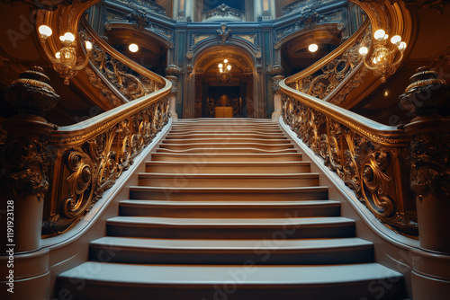 © Sekai, Obraz premium Majestic Concert Hall Stairway Highlighted by Polished Features
