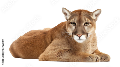 © Sunny_nsk, Obraz premium Majestic Cougar Lying Comfortably on White Background, png element with transparency