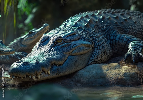 Fototapeta premium Majestic crocodile resting on rocky shore by serene water, showcasing its textured skin and powerful presence in lush natural environment