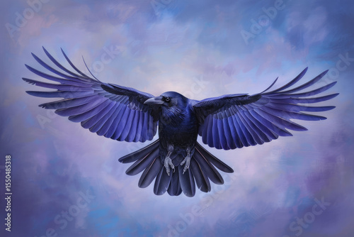 © Kritsadee, Naklejka premium Majestic crow soars through vibrant sky, showcasing its expansive wings and striking plumage. blend of colors in background enhances bird elegance and grace