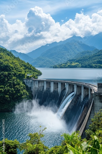 © Syahrul Zidane A, Fototapeta premium Majestic Dam Overlooking Serene Mountain Lake: A Breathtaking View of Hydroelectric Power
