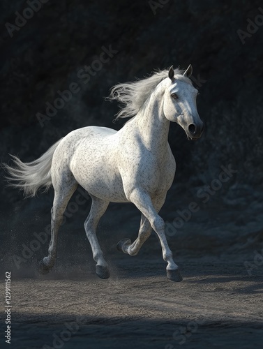 Obraz premium Majestic dapple grey horse galloping with power and grace on dark soil